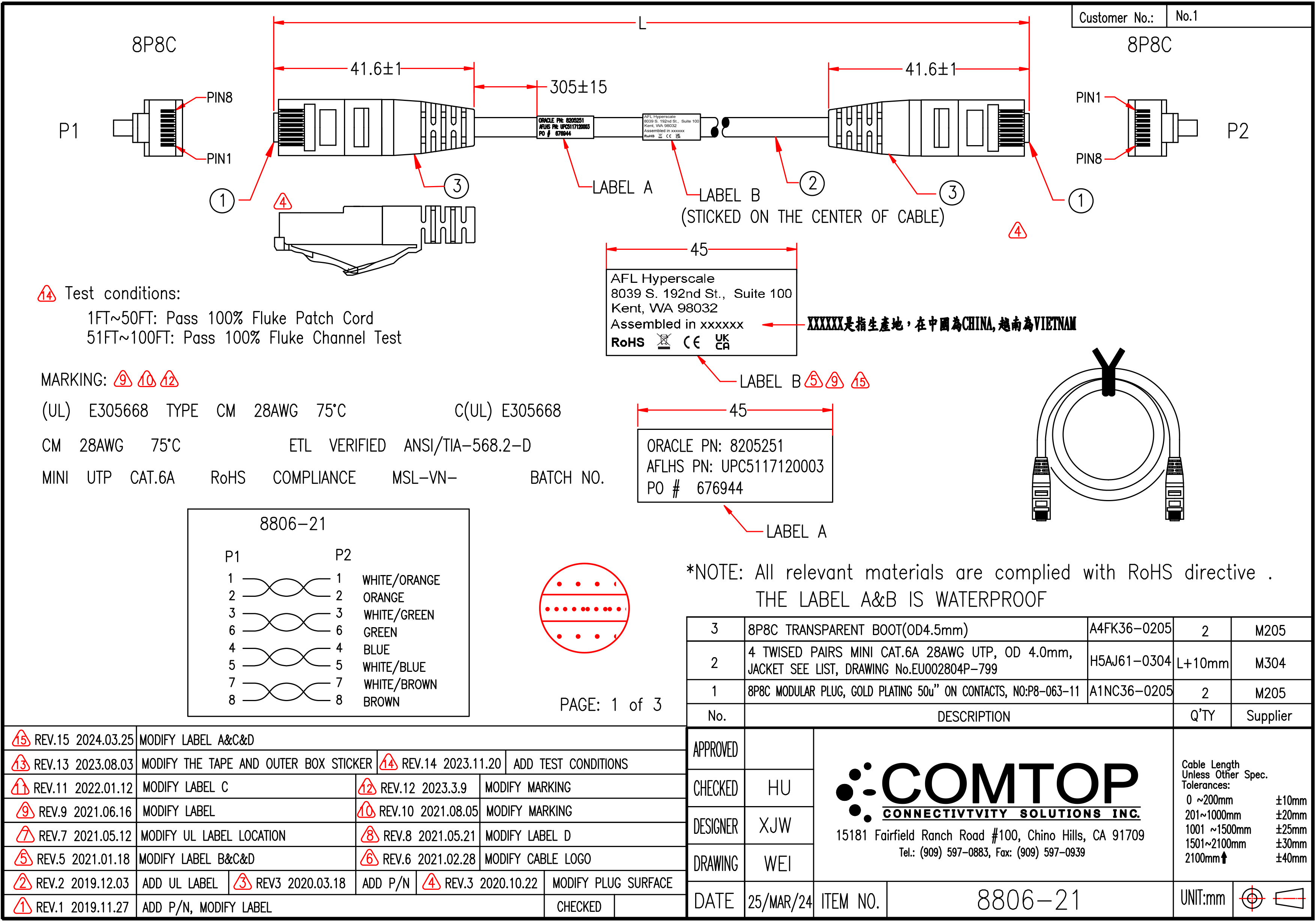 | Wire specification | UTP MINI CAT.6A #28 4PR OD4.0(EU002804P-799) |