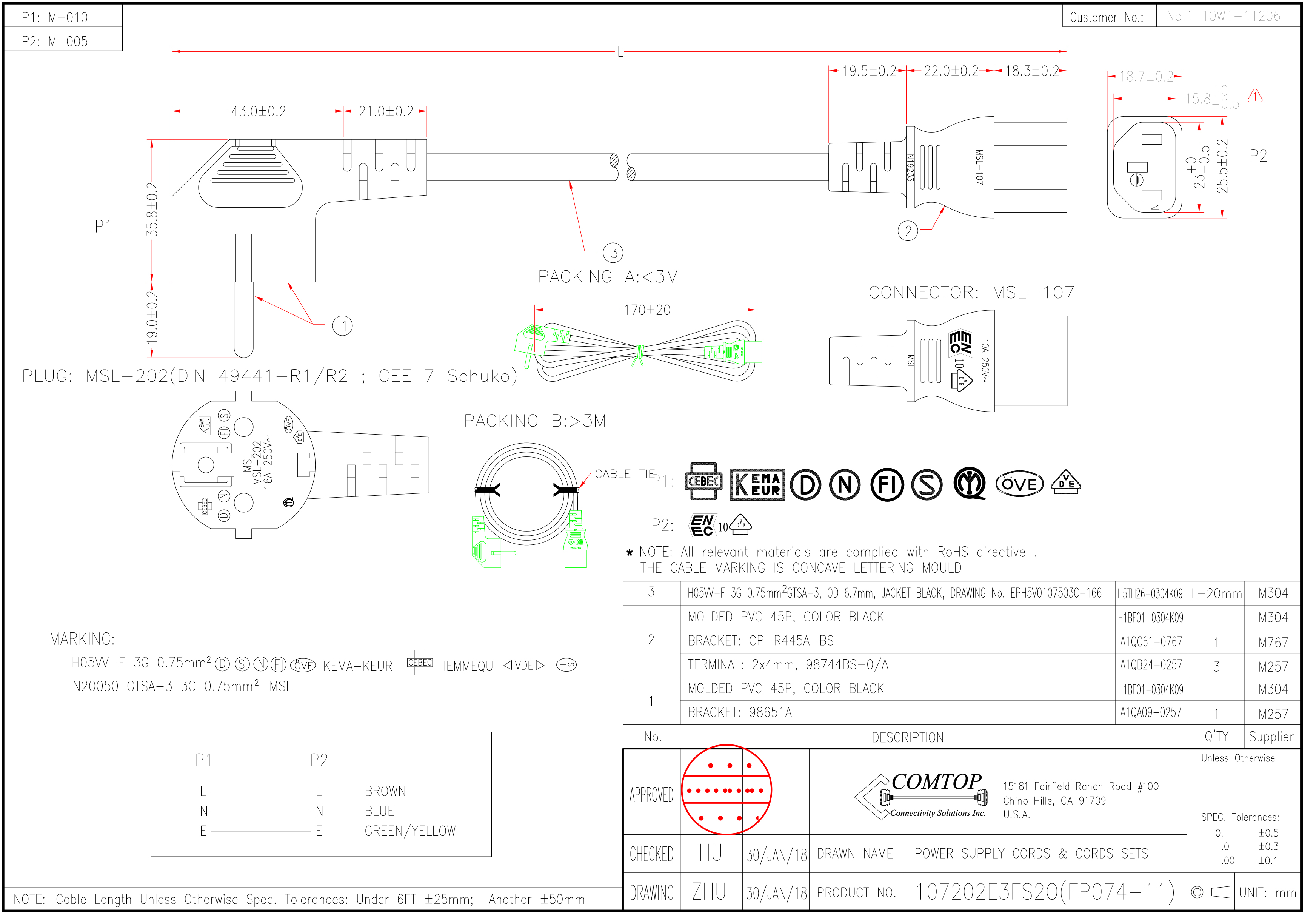 | Wire specification | H05VV-F 3G 0.75mm2 GTSA-3 OD6.8 ( EPH5V0107503C-004) |