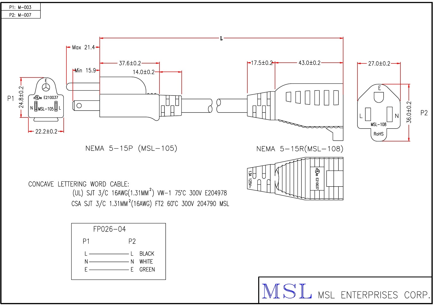 | Wire specification | UL SJT #16 3C OD8.5 (EPSVT011603C-058) |