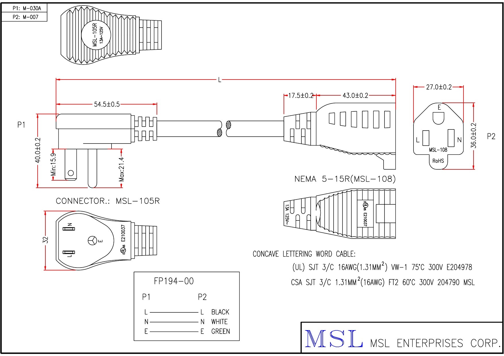 | Wire specification | UL SJT #16 3C OD8.5 (EPSVT011603C-058) |
