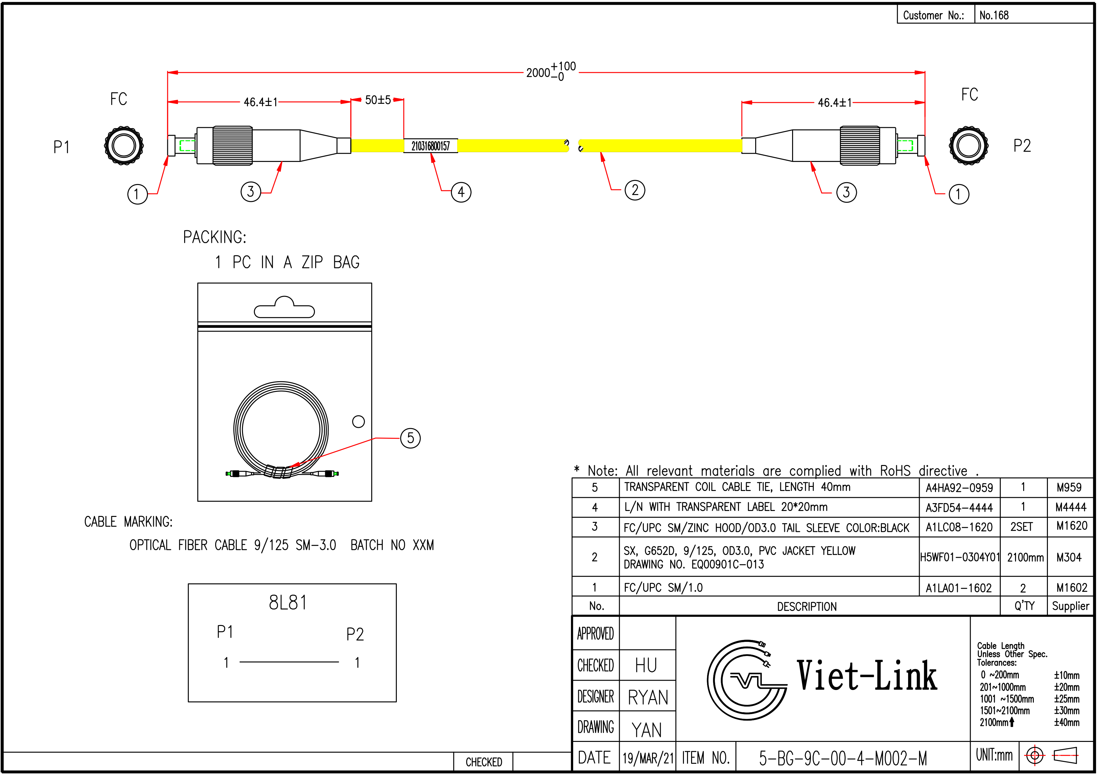 | Wire specification | SX, G652D, 9/125, OD3.0, PVC JACKET YELLOW DRAWING NO. EQ00901C-013 |
