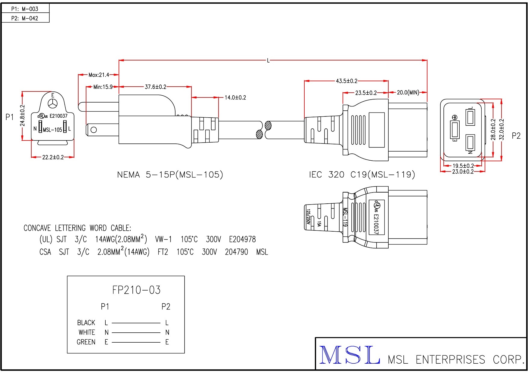 | Wire specification | UL SJT #14 3C OD9.3 (EPSVT011403C-147) |