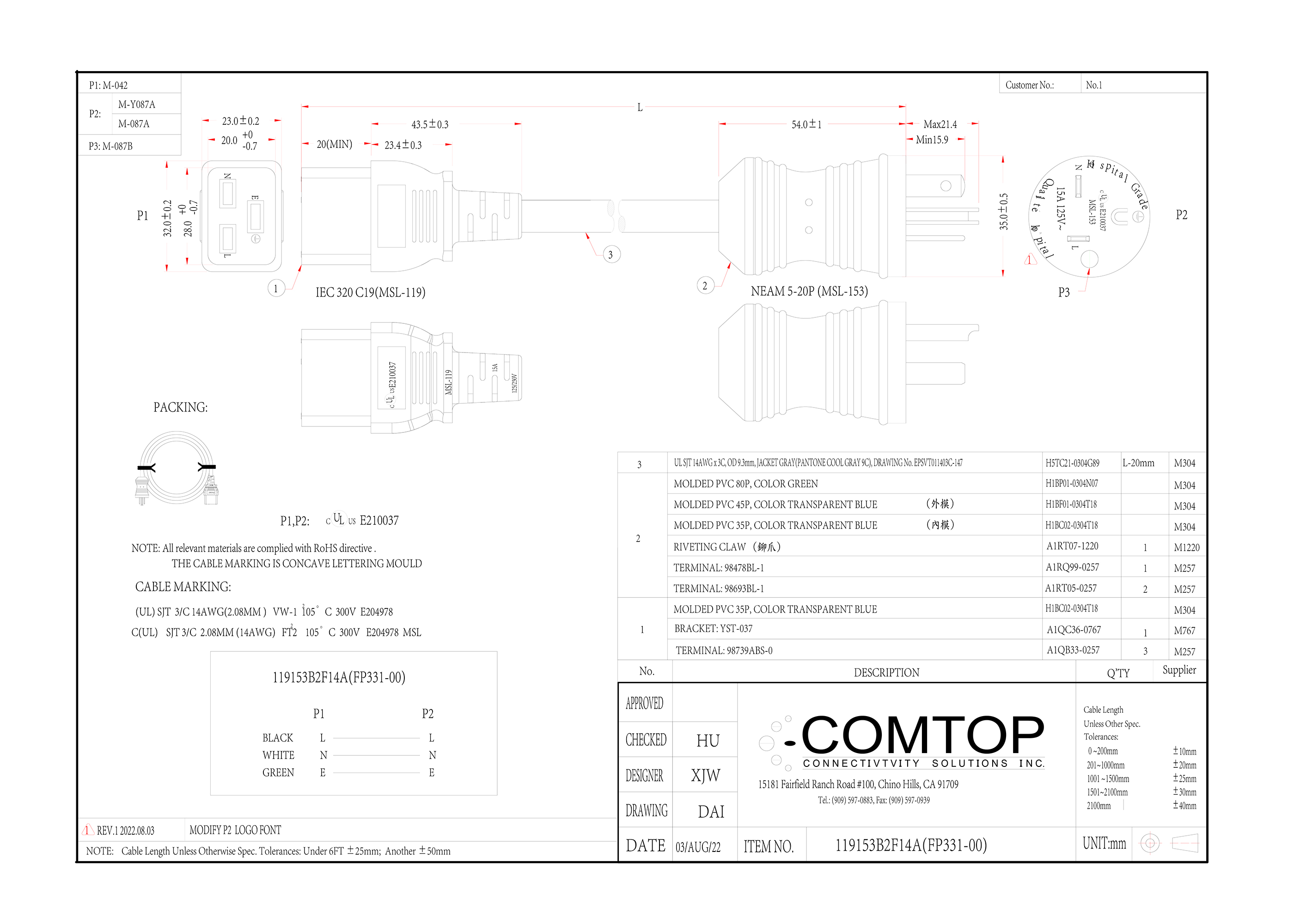 | Wire specification | UL SJT 14AWG x 3C, OD 9.3mm, JACKET GRAY(PANTONE COOL GRAY 9C), DRAWING No. EPSVT011403C-147 |