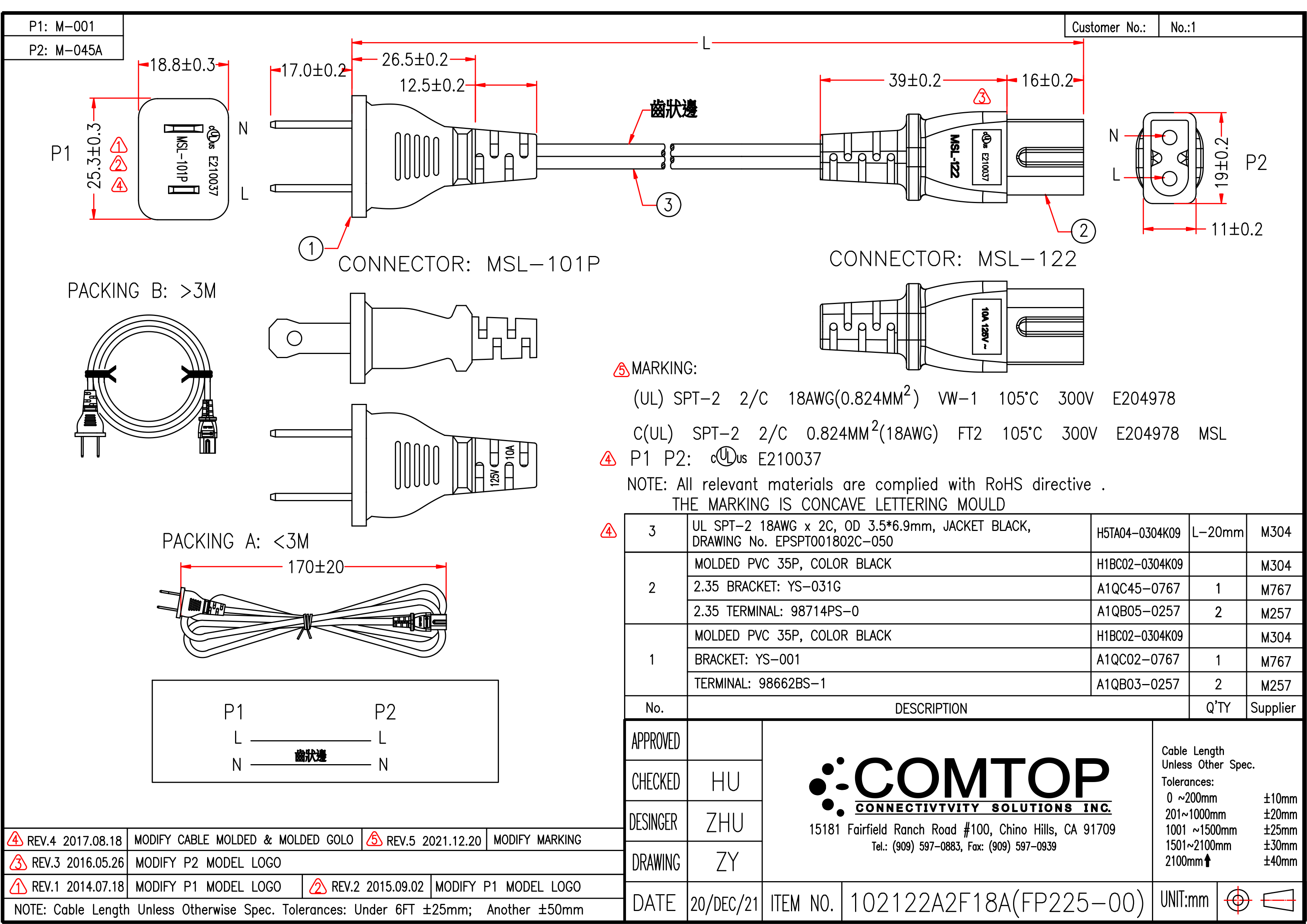 | Wire specification | UL SPT-2 18AWG x 2C, OD 3.5*6.9mm, JACKET BLACK,DRAWING NO.EPSPT001802C-050 |