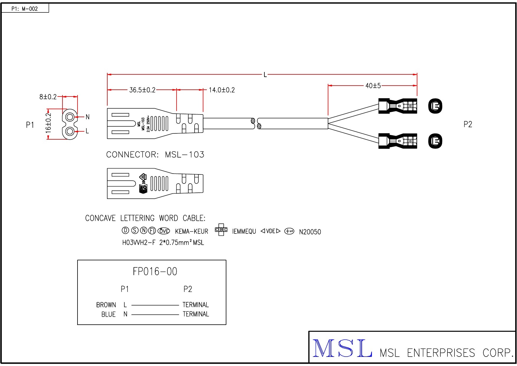 | Wire specification | 'H03VVH2-F 2C 0.75mm2 OD3.5*5.7 (EPH3V0107502C-001) |