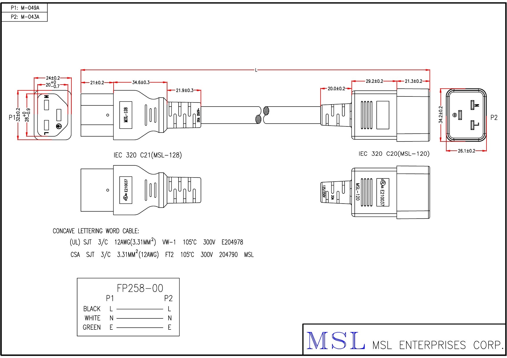 | Wire specification | UL SJT 12AWG x 3C 105C OD 11.0mm (EPSJT011203C-158) |