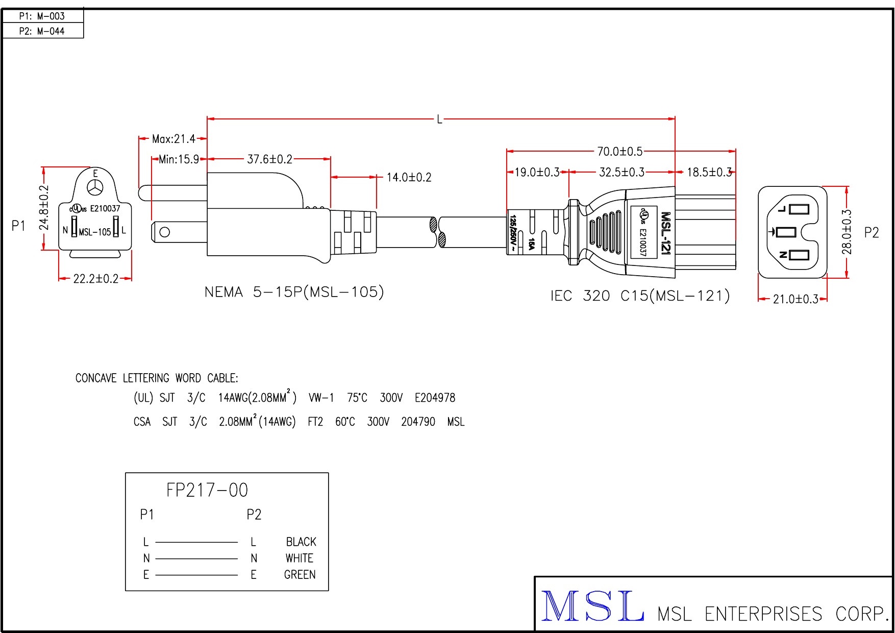 | Wire specification | UL SJT #14 3C OD9.3 (EPSVT011403C-012) |
