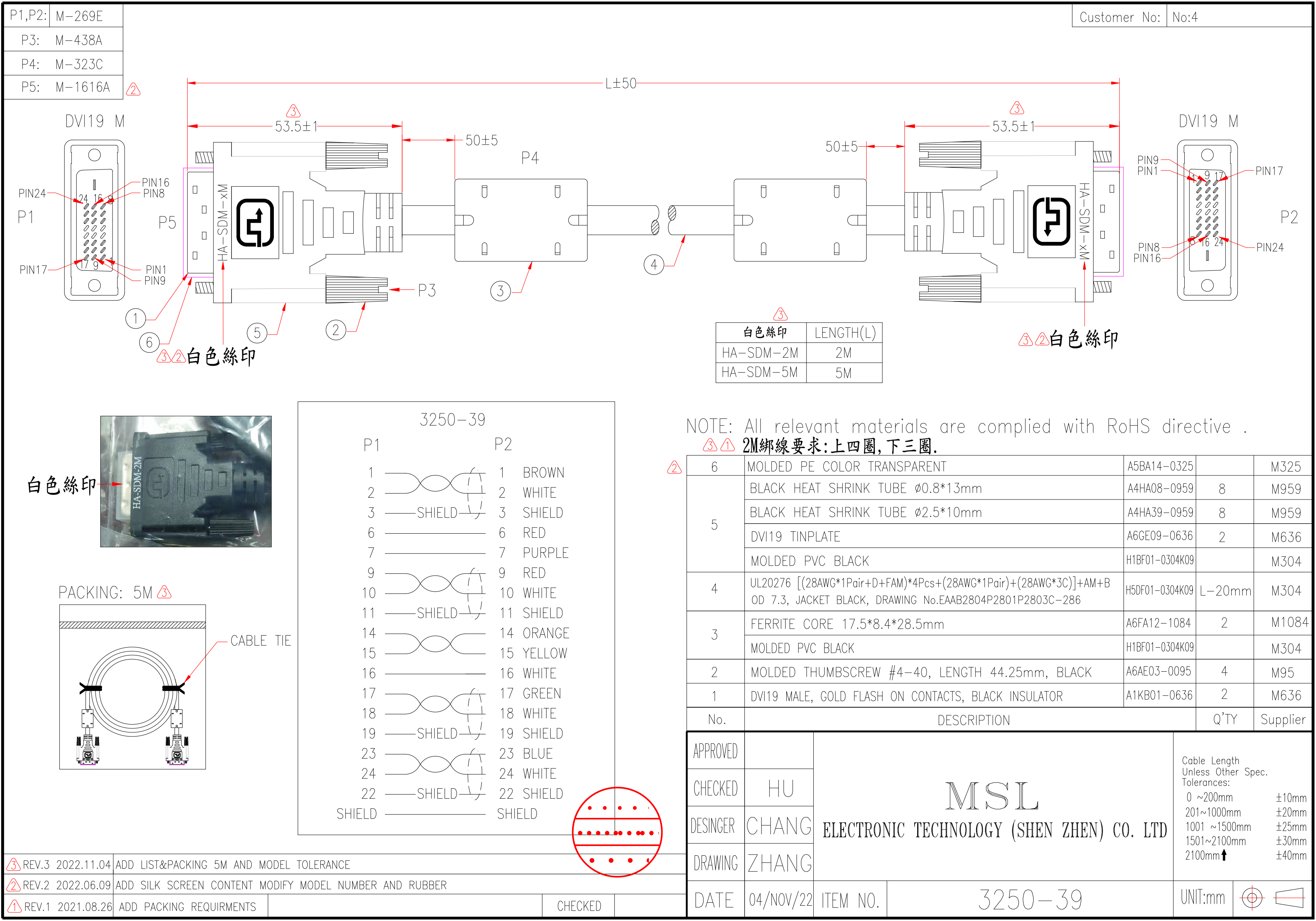 | Wire specification | UL20276 [(28AWG*1Pair+D+FAM)*4Pcs+(28AWG*1Pair)+(28AWG*3C)]+AM+BOD 7.3,JACKET BLACK, DRAWING NO.EAAB2804P2801P2803C-286 |