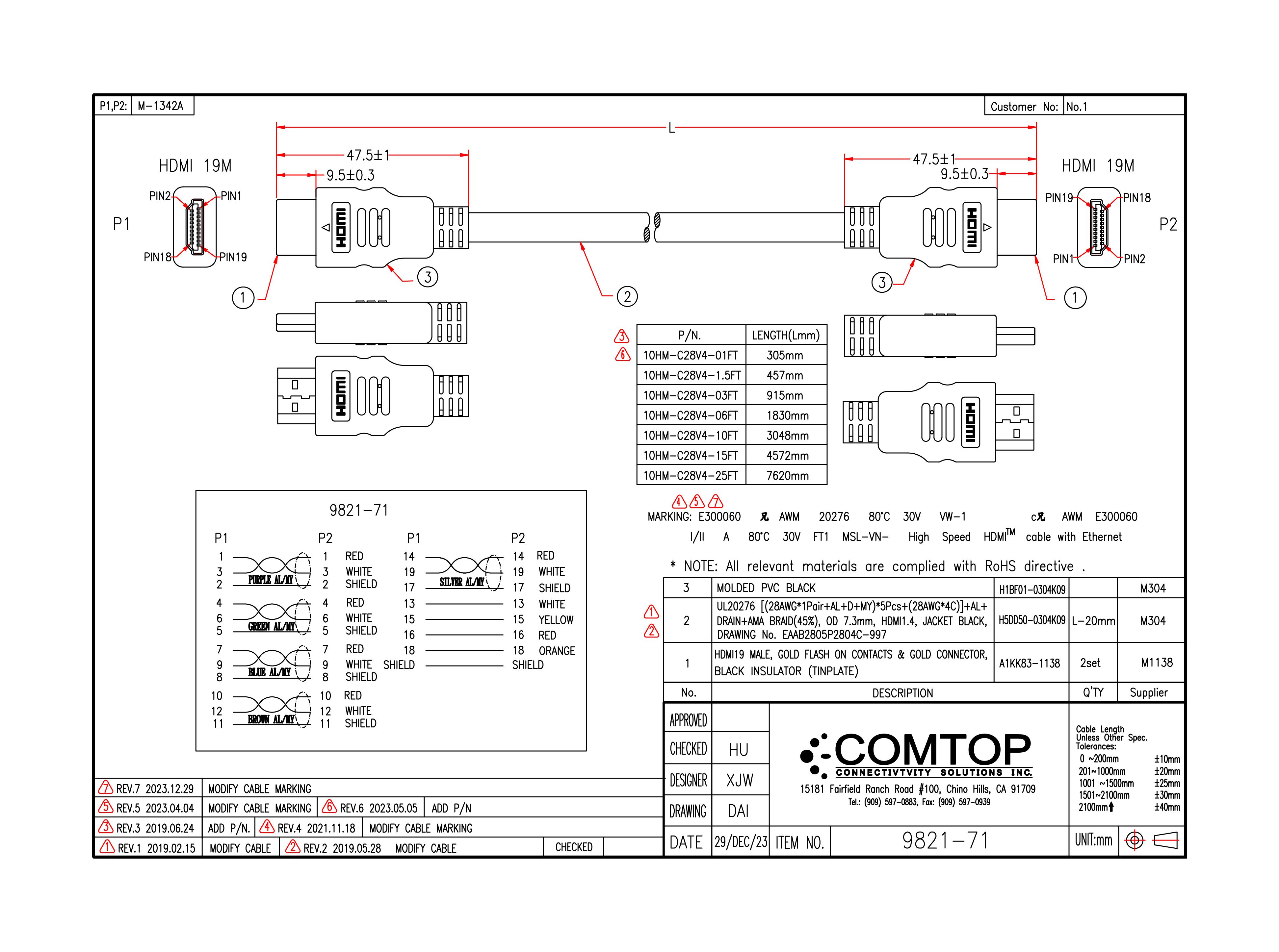 | Wire specification | UL20276 [(28AWG*1Pair+AL+D+MY)*5Pcs+(28AWG*4C)]+AL+DRAIN+AMA BRAID(45%),0D 7.3mm,HDMI1.4, JACKET BLACK,DRAWING NO. EAAB2805P2804C-997 |