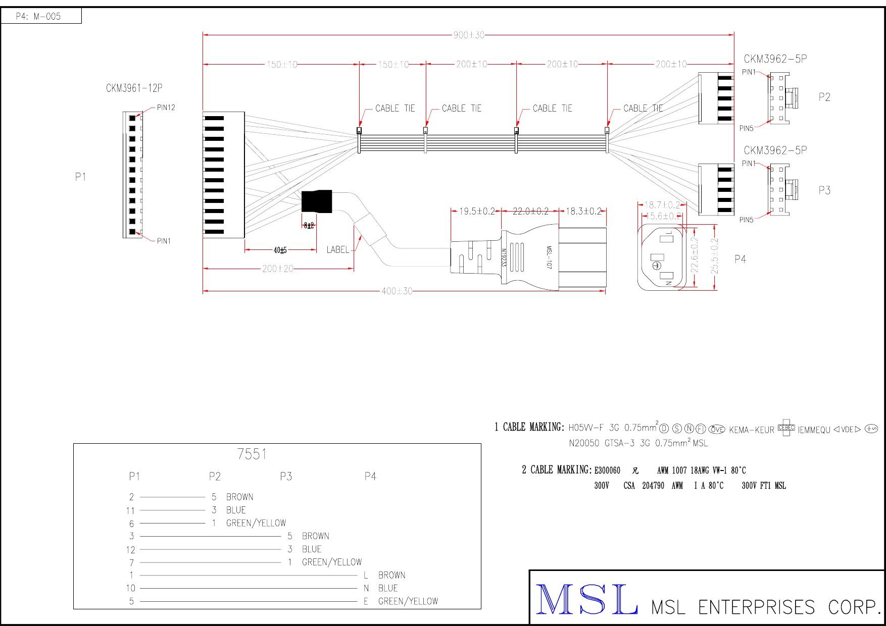 | Wire specification | H05VV-F 3G 0.75mm2 GTSA-3 OD6.8 (EPH5V0107503C-004) UL1007 #18 1C OD2.25 (EH001801C-001) |